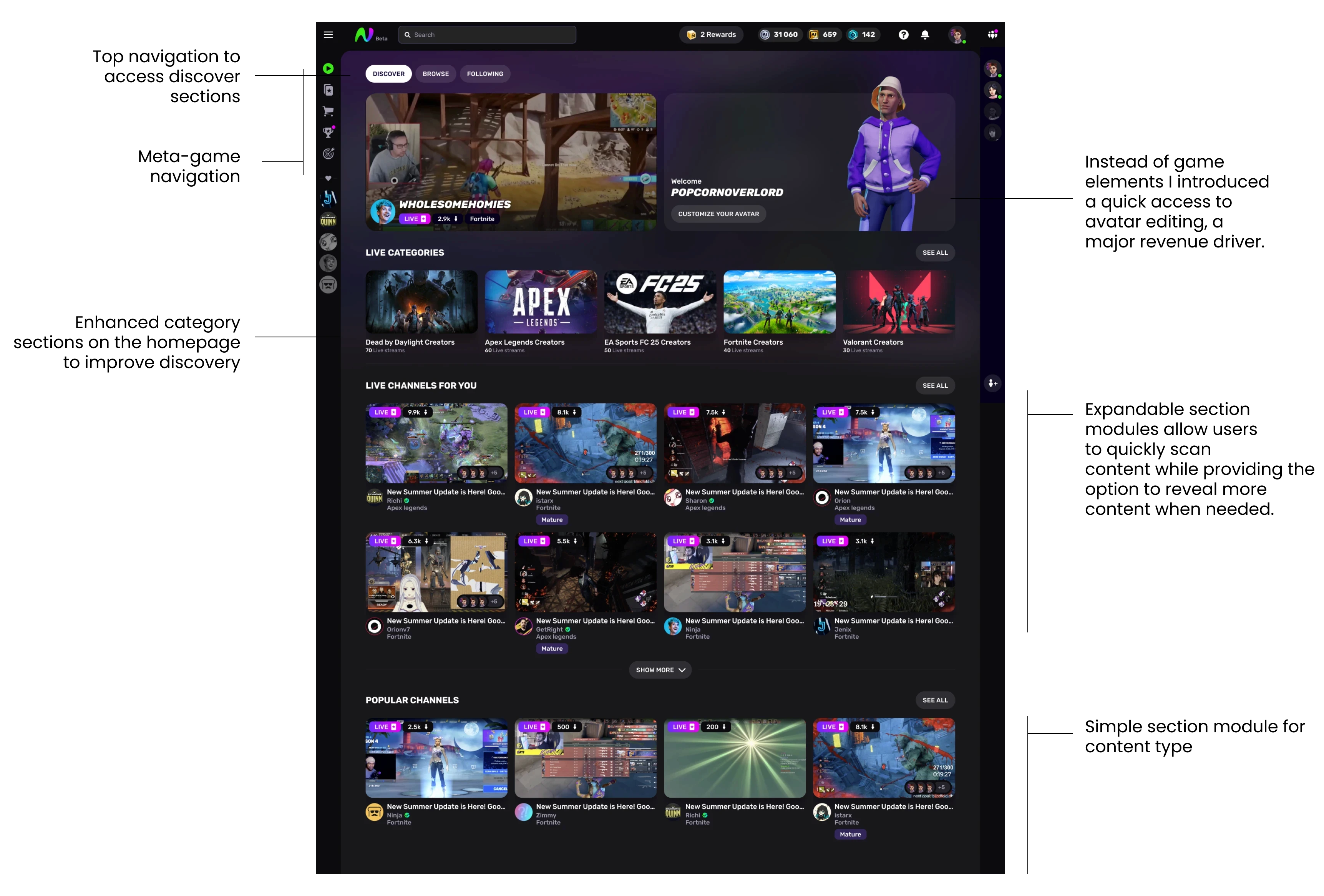 I reworked navigation, clarified the content hierarchy, and introduced features that highlight creators. The result is an updated look and feel that stays true to Noice’s game-first identity while making discovery more intuitive and scalable.